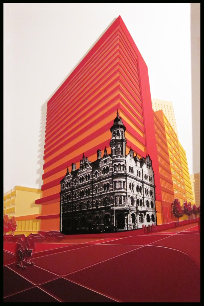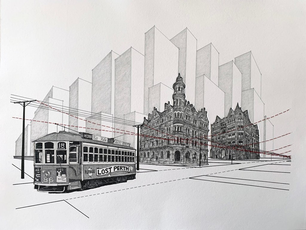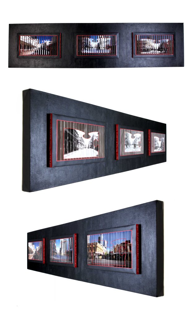 This artwork represents some of the lost icons of Perth. Usually when something is destroyed it is represented as a “ghost” impression. By inverting this, the depiction of the demolished buildings highlights the importance of the intricate detailing of what was lost when compared to the present day, impersonal, built form environment. Our urban landscape has lost its soul.