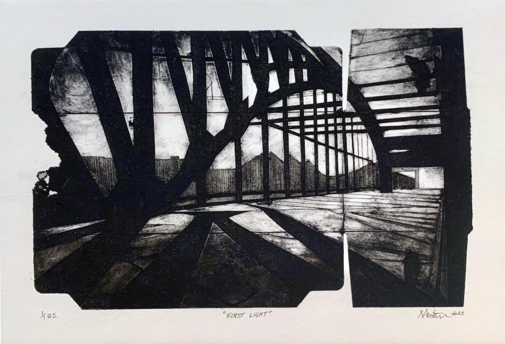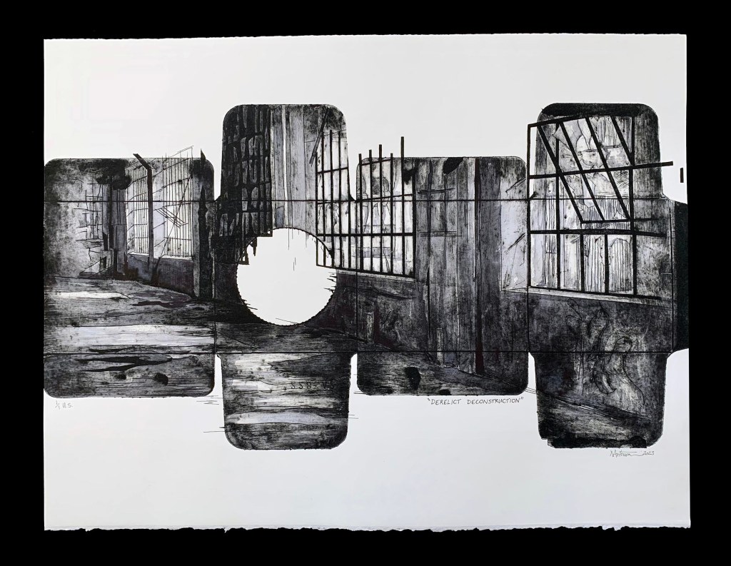 This collagraph plays with the shapes of the repurposed box whilst exploring the tonal variances of light on the subject matter. The cardboard box destined for recycling is repurposed as an intaglio plate using the natural textures of the cardboard box to scribe and print an intaglio print. The contrast of the bridge structure against the fragile nature of the repurposed and recycled cardboard collagraph plate creates an interesting juxtaposition. The fragile nature of the cardboard material results in very limited editions or unique state prints as the plate slowly disintegrates with each print. Beauty is found in using materials that are to be discarded to create an artwork that celebrates the beauty still found in buildings which have fallen into ruin themselves as they age.