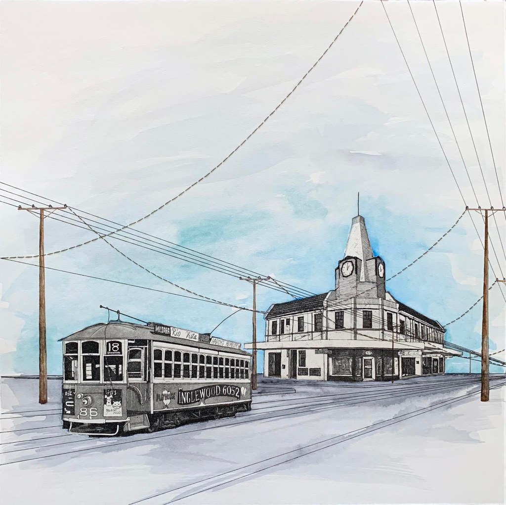 The Inglewood clock tower is a significant historical building. The copper plate etching process is done entirely by hand using a multi-stage process. This work was created using hand cut and shaped etching plates, hand colouring and hand stitching.